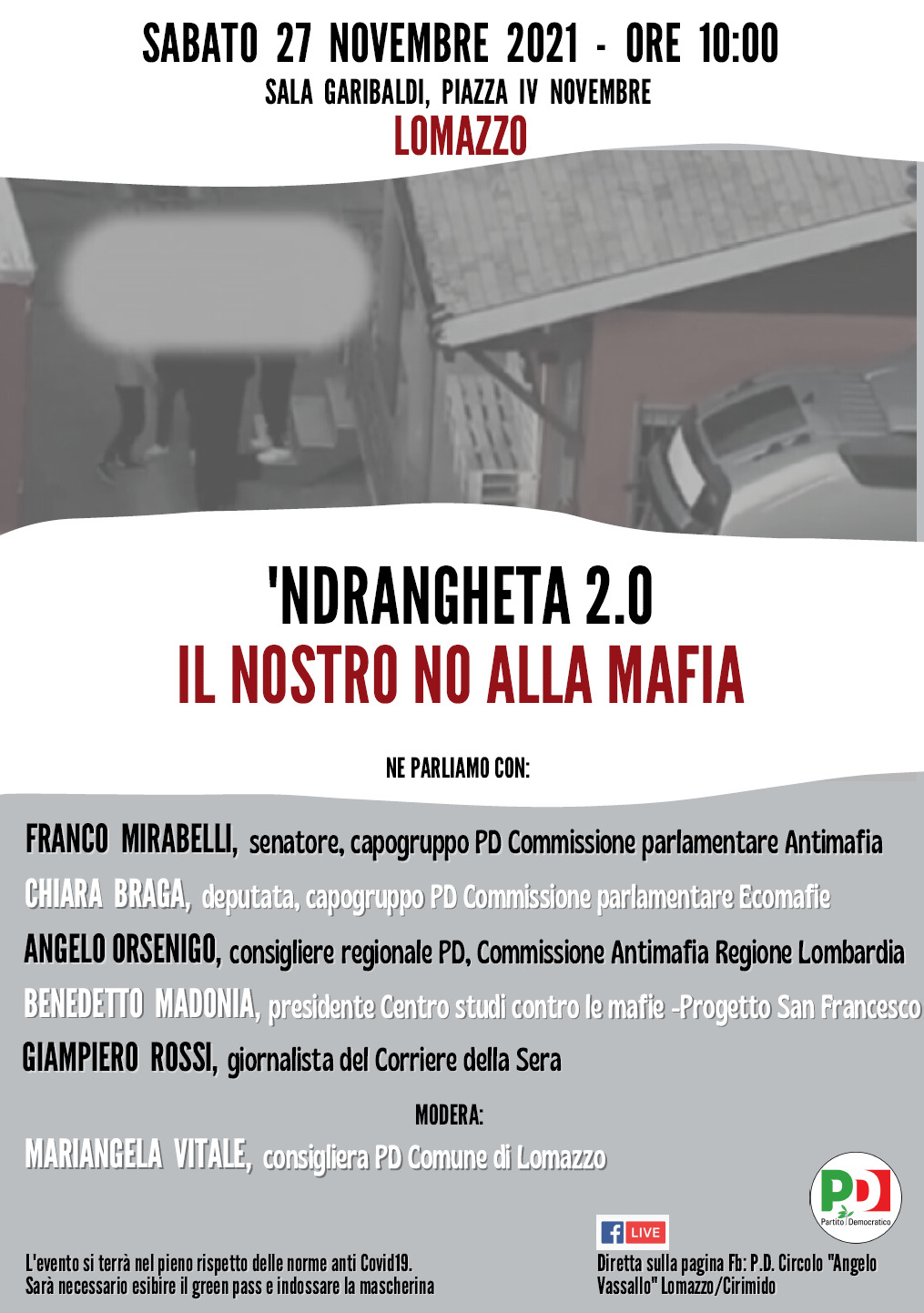 Sabato 27 novembre alle ore 10.00 presso la Sala Garibaldi in piazza IV Novembre a Lomazzo si terrà l’incontro “’ndrangheta 2.0. Il nostro no alla mafia” con il senatore Franco Mirabelli (Vicepresidente del Gruppo PD al Senato e capogruppo PD in Commissione Parlamentare Antimafia), l’on. Chiara Braga (capogruppo PD Commissione Parlamentare Ecomafie), Angelo Orsenigo (Consigliere Regionale PD, Componente della Commissione Antimafia del Consiglio Regionale della Lombardia), Benedetto Madonia (Presidente del Centro Studi contro le mafie – Progetto San Francesco), Giampiero Rossi (Giornalista del Corriere della Sera) e Mariangela Vitale (Consigliera PD Comune di Lomazzo).