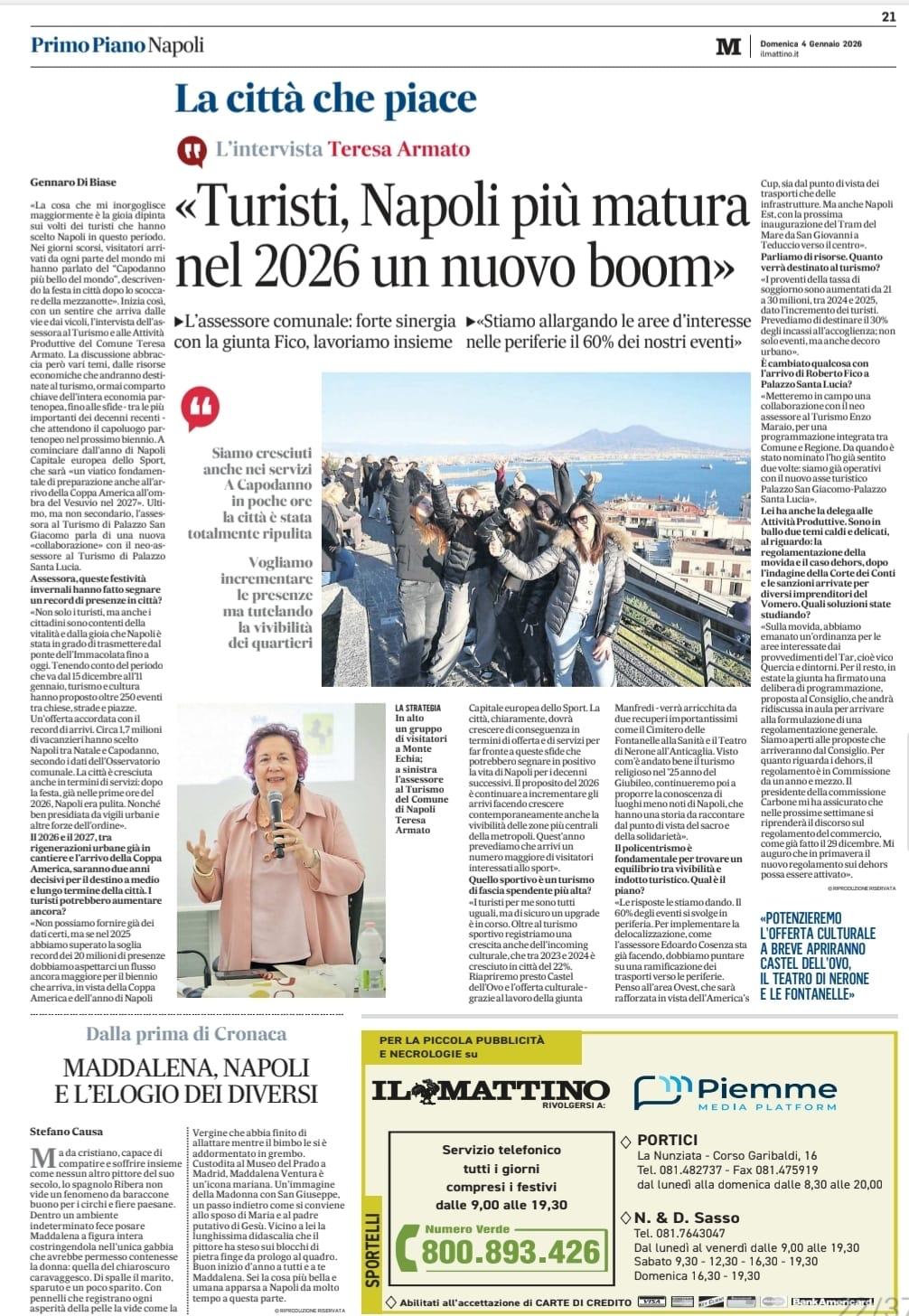 Armato: una Napoli piu' matura, nel 2026 nuovo boom di turisti